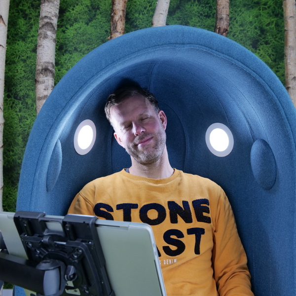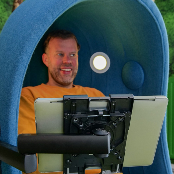 De 4-Senses akoestische stoel is een innovatieve, akoestische stoel waarmee omgevingsprikkels gereduceerd worden. Zodra je plaatsneemt in de stoel, ervaar je een veilig en geborgen gevoel doordat de stoel zich als een cocon om je heen vormt. De stoel heeft ingebouwde geluidsboxen waarmee rustgevende muziek afgespeeld kan worden. Ook heeft de stoel speciale verlichting die in allerlei kleuren afgesteld kan worden. Met de tablethouder kan een tablet aan de stoel bevestigd worden, zodat je video’s kunt afspelen. Dit alles om een ontspannen sfeer te creëren.