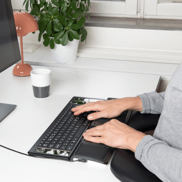 De Mousetrapper Advance 2.0+ is ontworpen om je polsen en schouders te ontlasten door de muis centraal voor het toetsenbord te plaatsen. Dit voorkomt overmatige reikbewegingen en draagt bij aan het voorkomen van klachten zoals RSI en KANS. Het strakke, slanke ontwerp past bij elke werkplek en zorgt voor meer comfort tijdens langdurig gebruik.