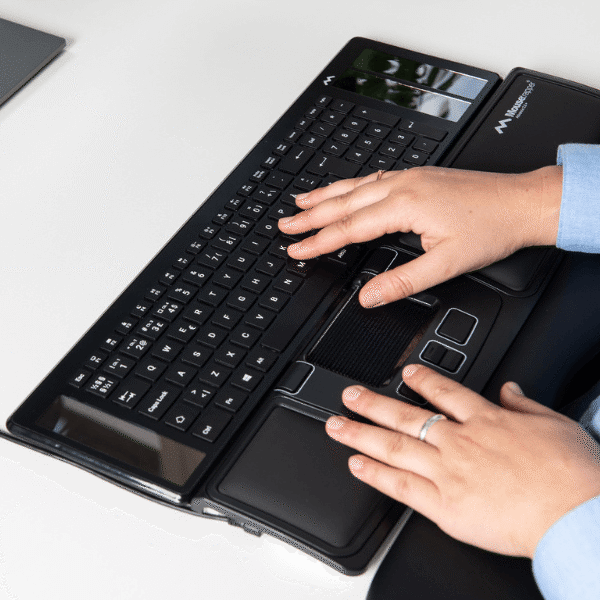 Een centrische muis, zoals de Mousetrapper Advance 2.0+, is ontworpen om direct voor het toetsenbord te worden geplaatst, zodat je met je handen binnen de natuurlijke houding blijft en overbelasting wordt voorkomen.