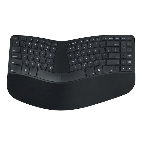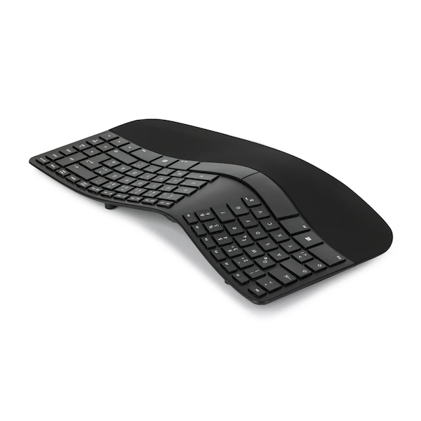 De gebogen vorm, gesplitste toetsen en zachte polssteun houden je handen in een natuurlijke positie en verminderen spierspanning.