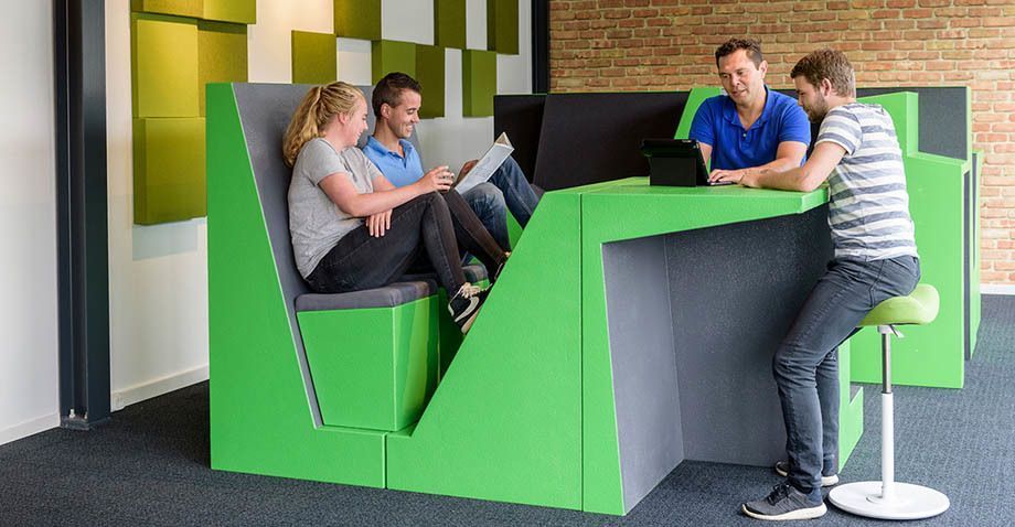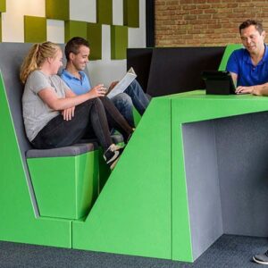 De Health2Work Cube bestaat uit 8 losse elementen. Deze elementen vormen met elkaar een vierkant, de Cube. De elementen kun je ook heel goed los van elkaar in een ruimte plaatsen. Kijk welk element goed bij je werk en omgeving past. De kleine tafel, de Scrum Cube, gebruik je voor een dagopening of een brainstormsessie. Wil je het werk onderbreken met een korte powernap? Dit doe je in de Lounge Cube.