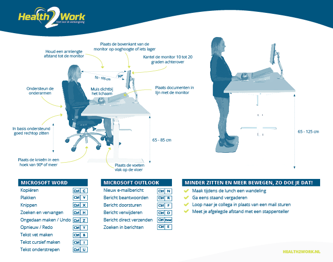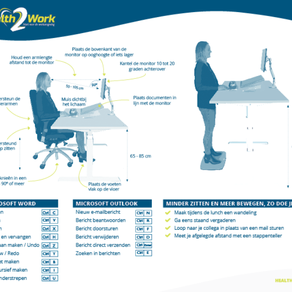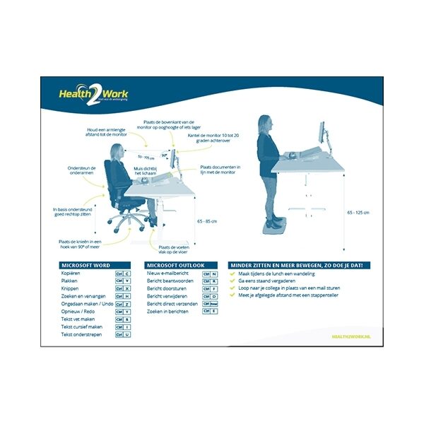 Deze exclusieve, ergonomische muismat met sneltoetsen en werkplektips is speciaal door Health2Work ontwikkeld. Met deze muismat heb je altijd een handige lijst met sneltoetsen en ergonomische werkplektips bij de hand. Extra handig: je kunt kiezen voor een standaard lijst of je kunt zelf een lijst met sneltoetsen samenstellen!