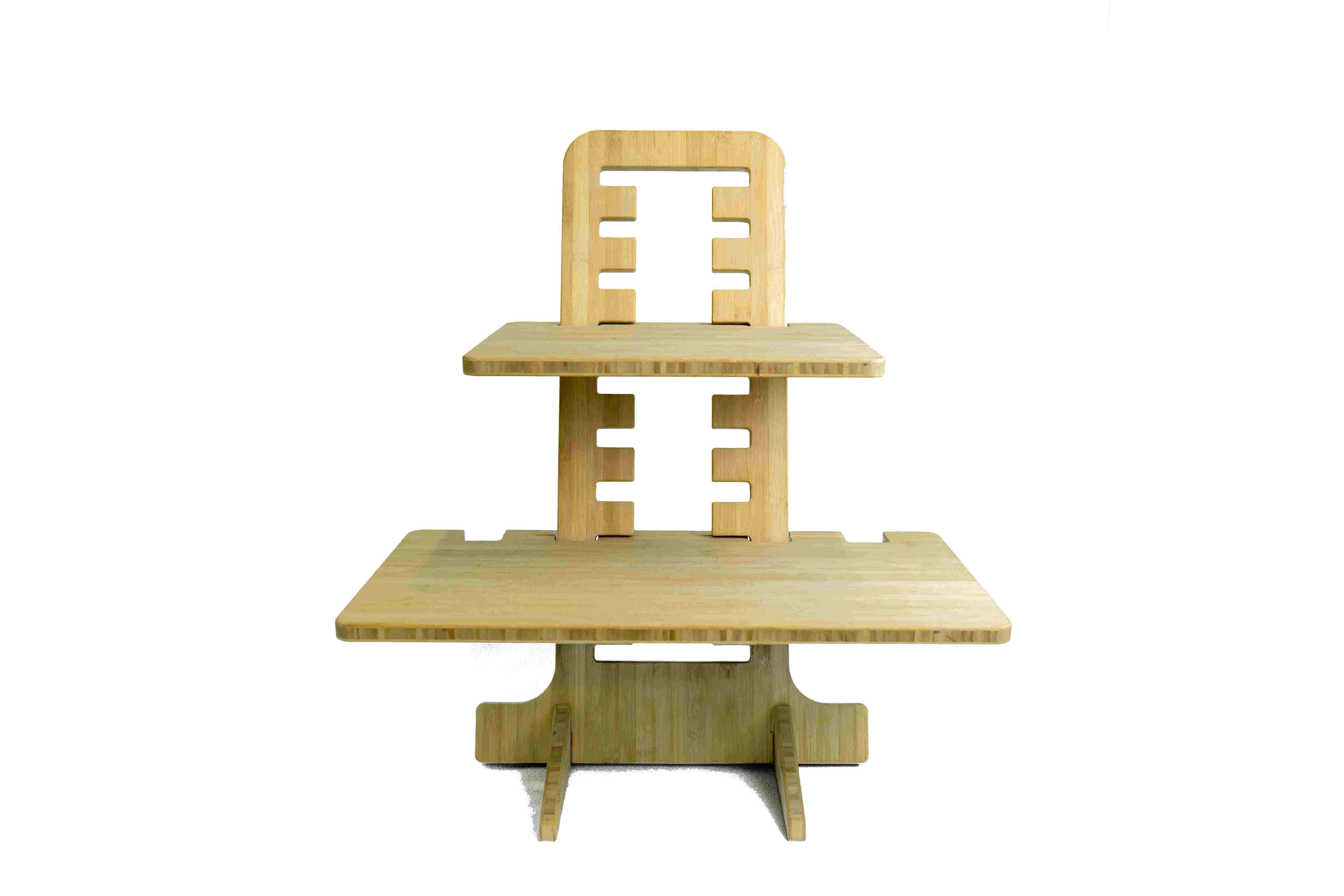 De OPNIEUW! - Bamboe zit sta Bureauverhoger kan eenvoudig in elkaar worden gezet. De standaard bestaat uit slechts vier onderdelen en kan zonder schroeven in elkaar worden geschoven. De standaard heeft twee werkbladen, één voor de monitor of laptop en één voor muis en toetsenbord. Beide werkbladen zijn uitgebreid instelbaar waardoor je altijd in de optimale staande werkhouding kunt werken.