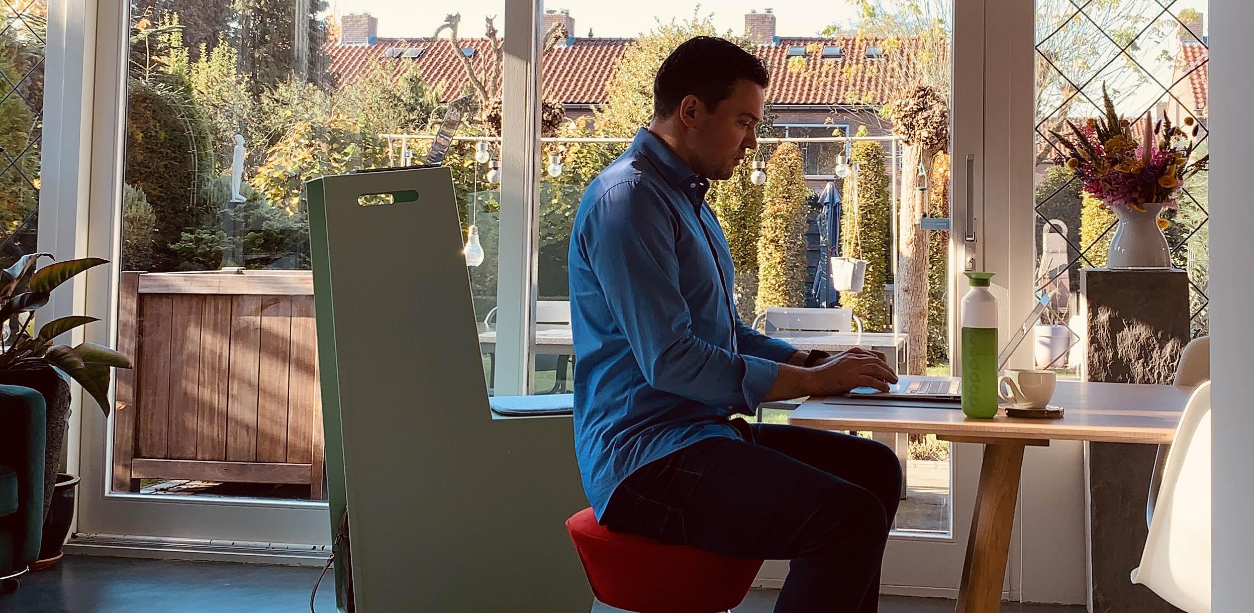 Klaas van Erp won een Swopper voor zijn thuiswerkplek en gebruikt deze sindsdien om meer af te wisselen tijdens het werken. De dynamische kruk stimuleert beweging, helpt statisch zitten doorbreken en past goed binnen een actieve werkdag thuis.
