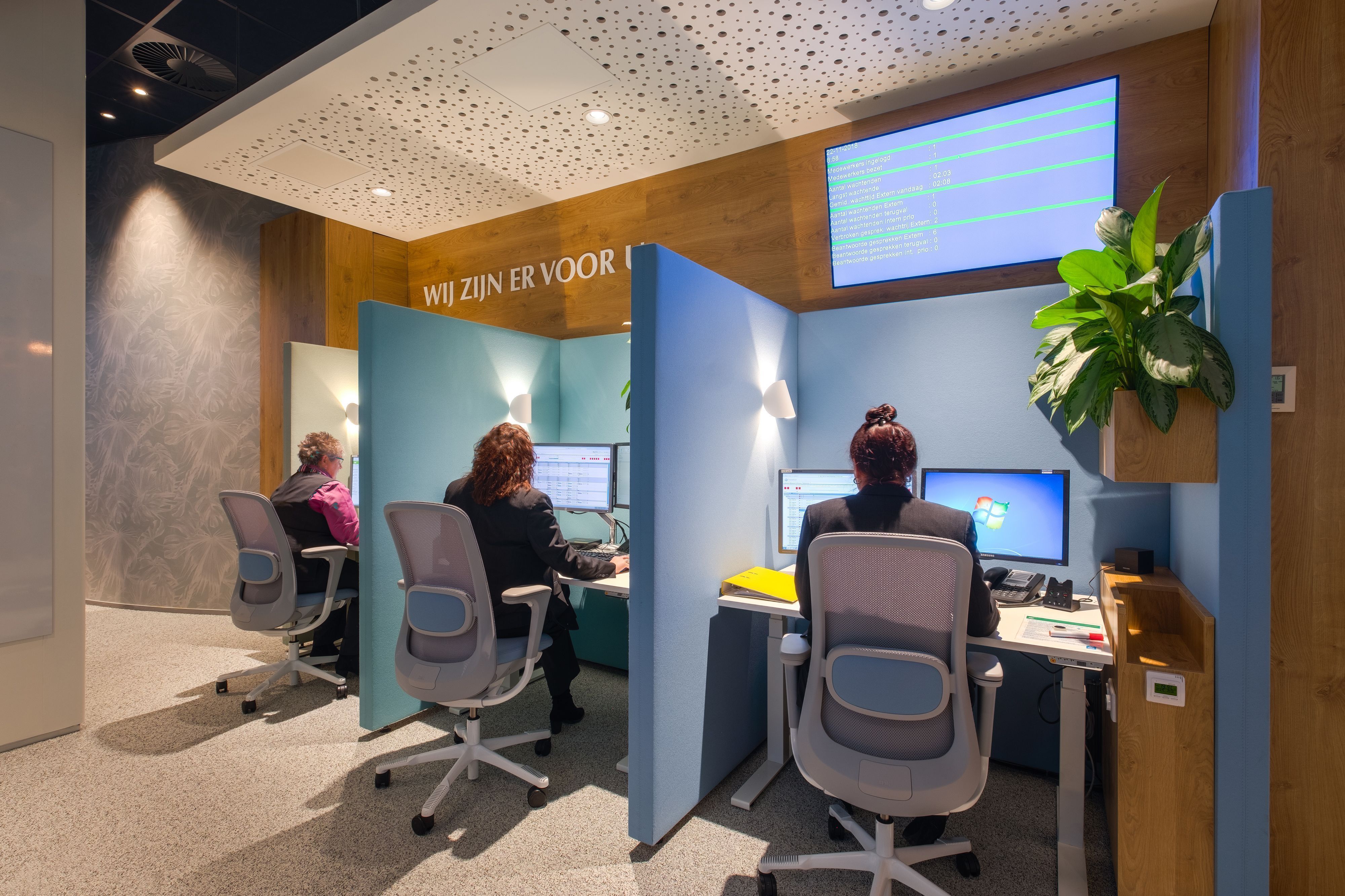 In het Klant Contact Centrum wordt veel gebeld. Hierdoor is het vaak rumoerig en is het lastig om je eigen gesprek goed te volgen. Dit is een veelvoorkomend probleem bij callcenters. Om ervoor te zorgen dat de medewerkers van het Klant Contact Centrum hun klanten goed te woord kunnen staan, hebben we akoestische wanden geplaatst. Hiermee wordt overlast door omgevingsgeluiden sterk verminderd en kan er in alle rust gebeld worden.