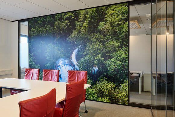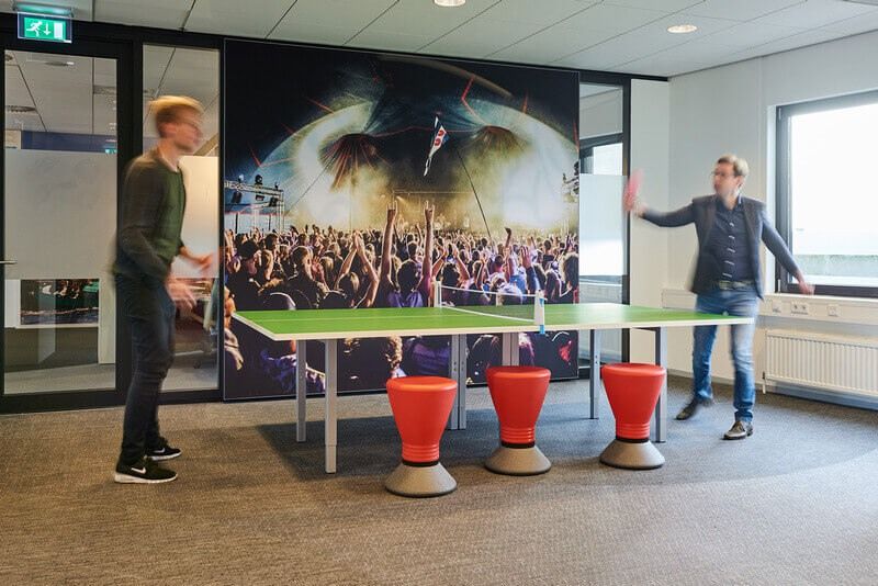 De akoestische werkhuisjes en plafonds zijn uniek in Nederland en gebouwd van volledig duurzame materialen. De huisjes komen tegemoet aan de behoefte van werknemers om in een open ruimte rustig te kunnen werken. De moswanden zorgen voor demping en een gezonder werkklimaat. De tafeltennistafel fungeert als vergadertafel en natuurlijk kun je er terecht voor een potje tafeltennis! Een groot succes onder de werknemers.