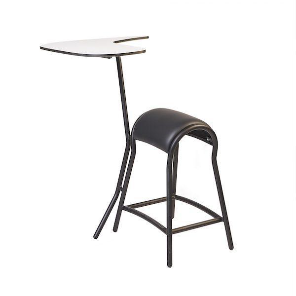 Het stalen onderstel zorgt voor blijvende stabiliteit. Het biedt op meerdere manieren mogelijke voetsteun. Het wisselen van je houding gaat erg makkelijk doordat er altijd genoeg ruimte is voor je benen. Je kan in een zadelzit gaan zitten of met je knieën omlaag. Hoogte: 65 cm met vormgegeven blad voor tablet, laptop of paper.